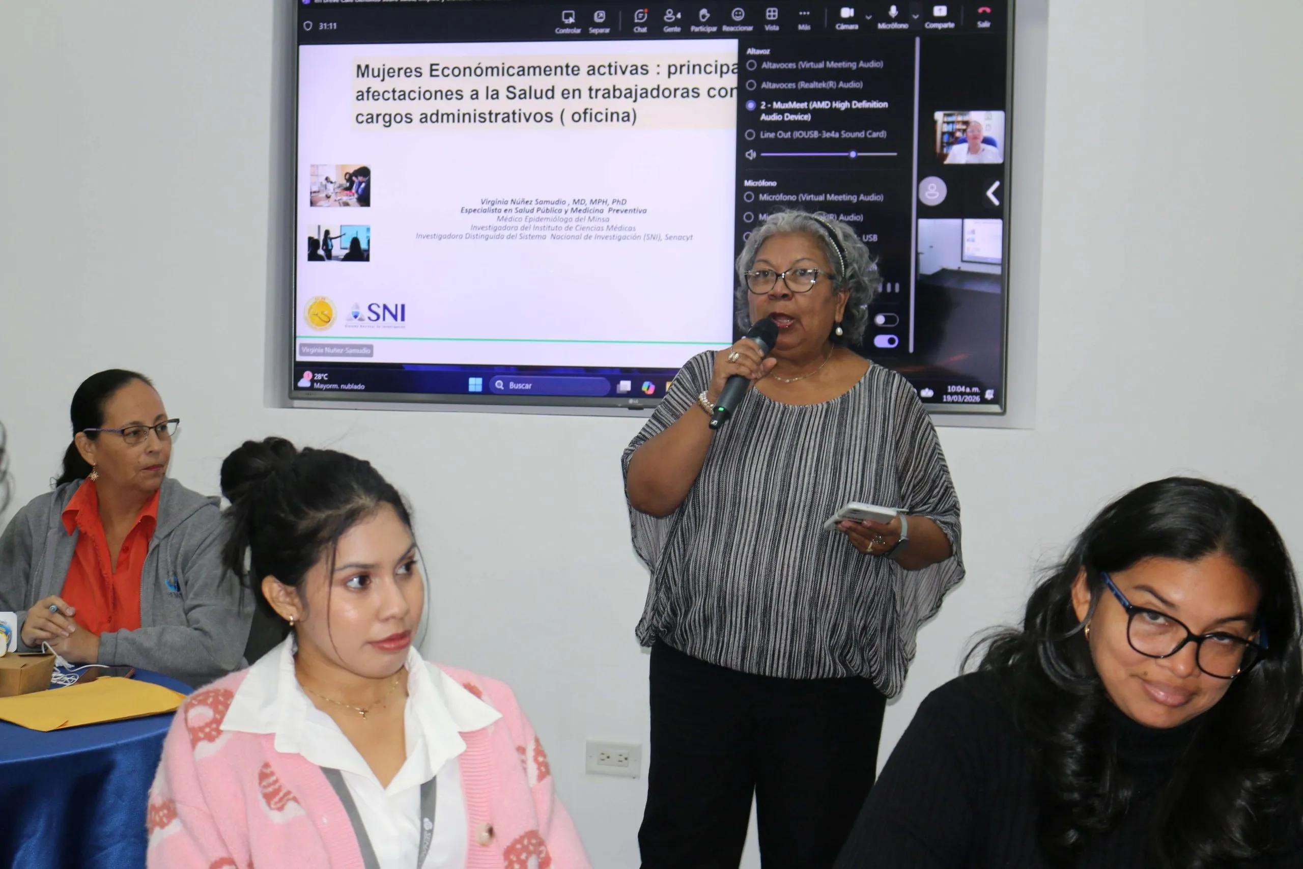 La Dra. Samudio abordó las principales causas de morbilidad en mujeres económicamente activas y su relación con el entorno laboral administrativo (trabajo de oficina), con un enfoque que permite a las mujeres reconocer los síntomas de éstas. Por ejemplo, los trastornos musculoesqueléticos (lumbalgia, cervicalgia, etc.), la fatiga digital y salud visual, salud mental (ansiedad, depresión, trastornos del sueño, etc.), estrés laboral y afecciones cardiometabólicas (sedentarismo, obesidad, hipertensión y dieta inadecuada).