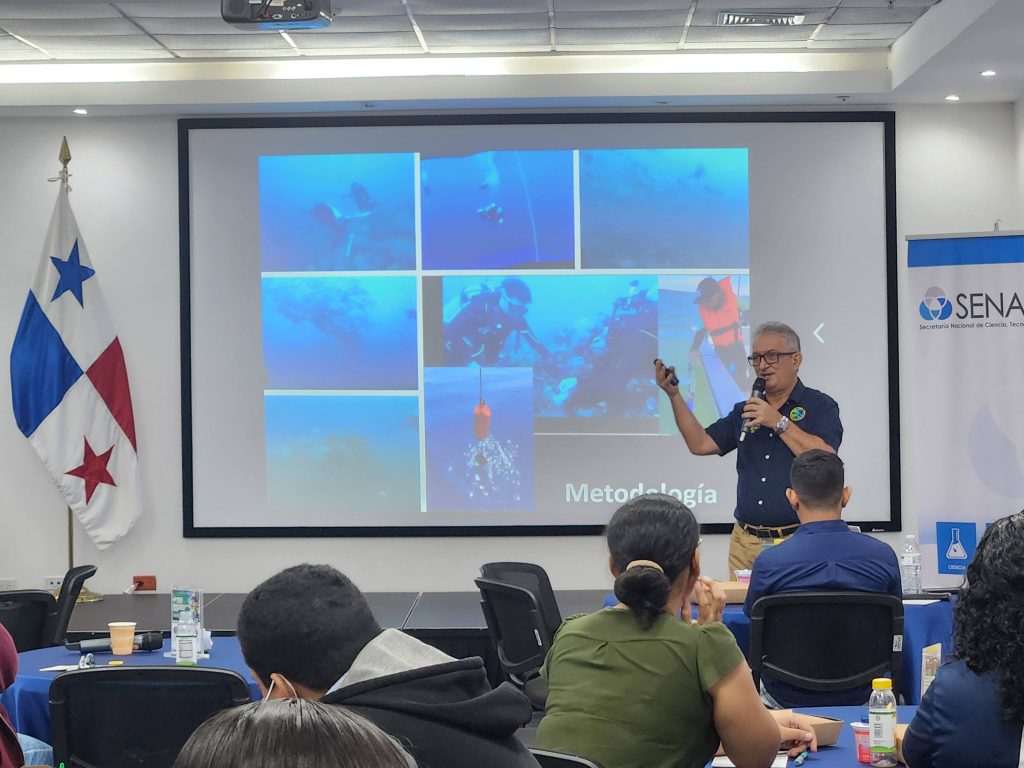 El Prof. Ángel Vega, director del Centro de Capacitación, Investigación y Monitoreo de la Biodiversidad en el Parque Nacional Coiba de la Universidad de Panamá (CCIMBIO-CRUV-UP), presentó el tema “Agregaciones reproductivas de peces: seis años de monitoreo”.